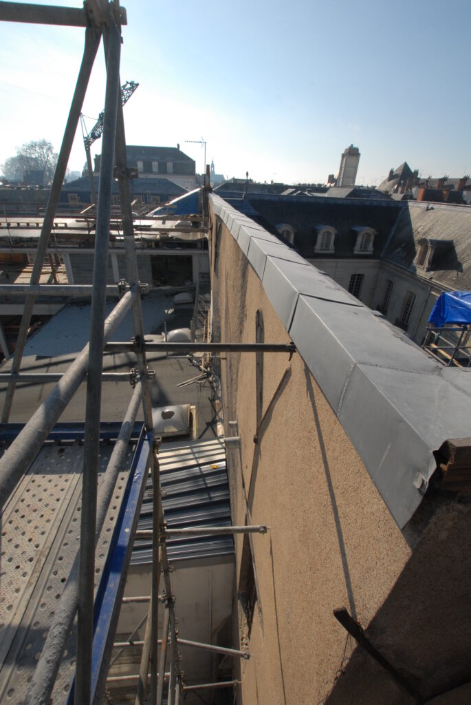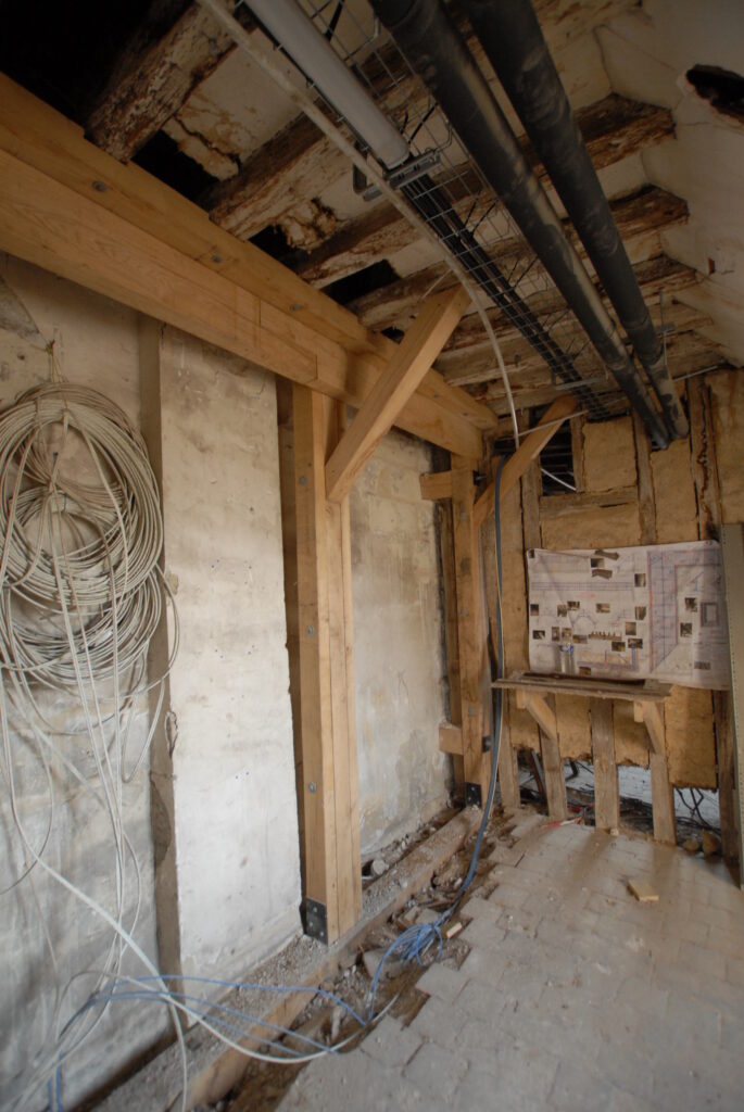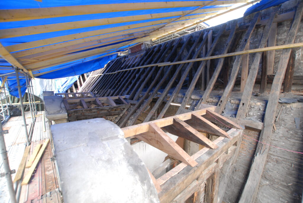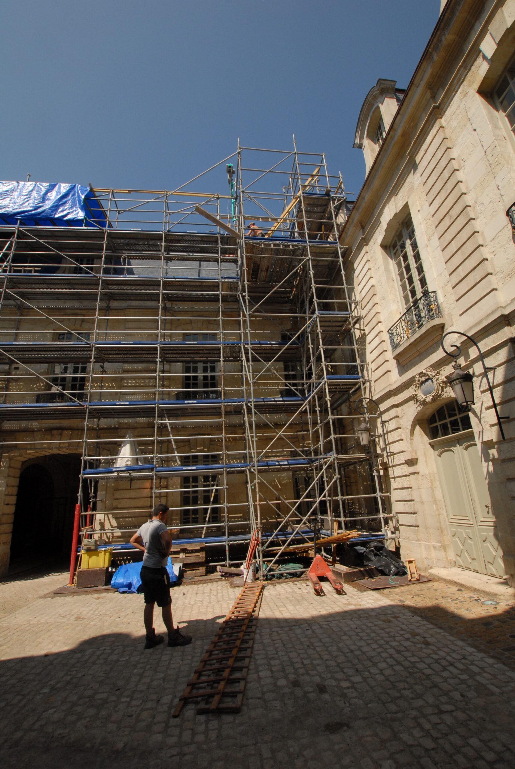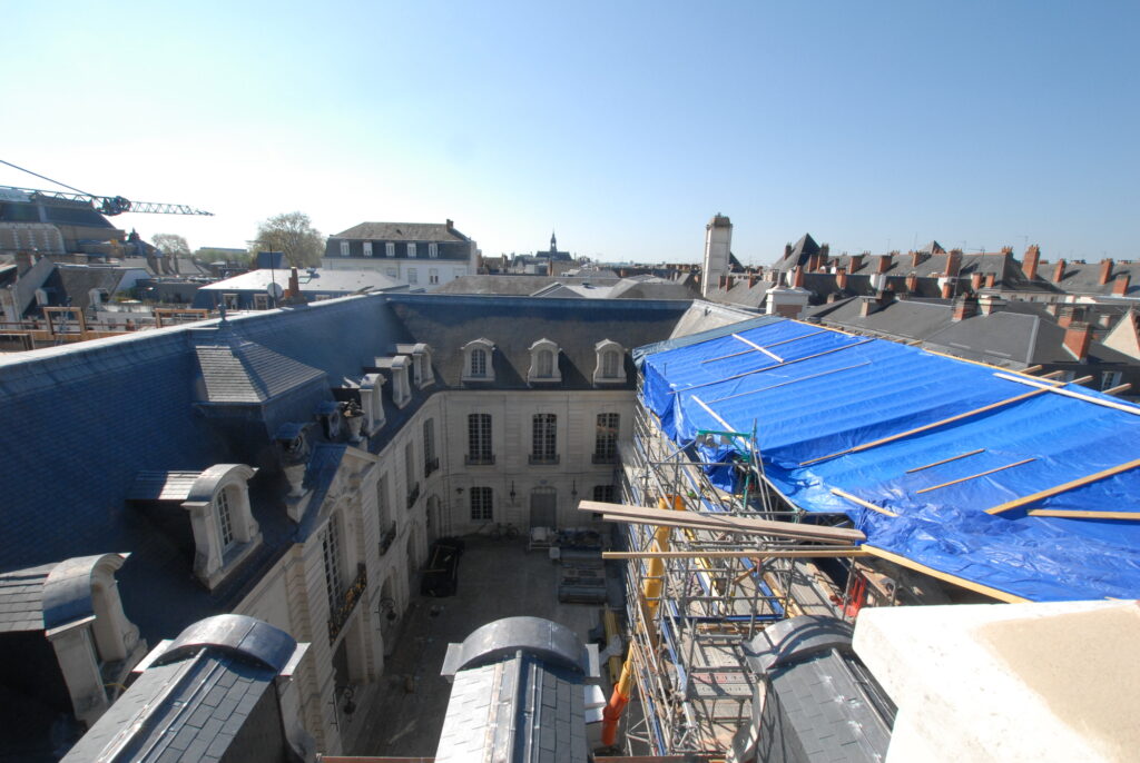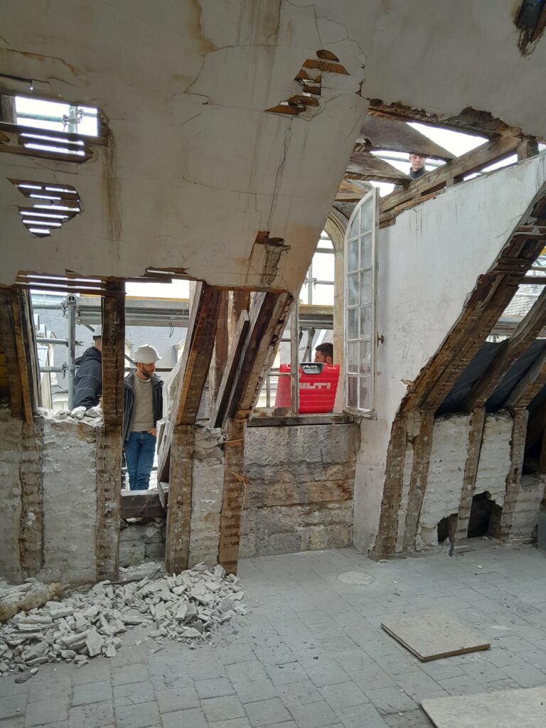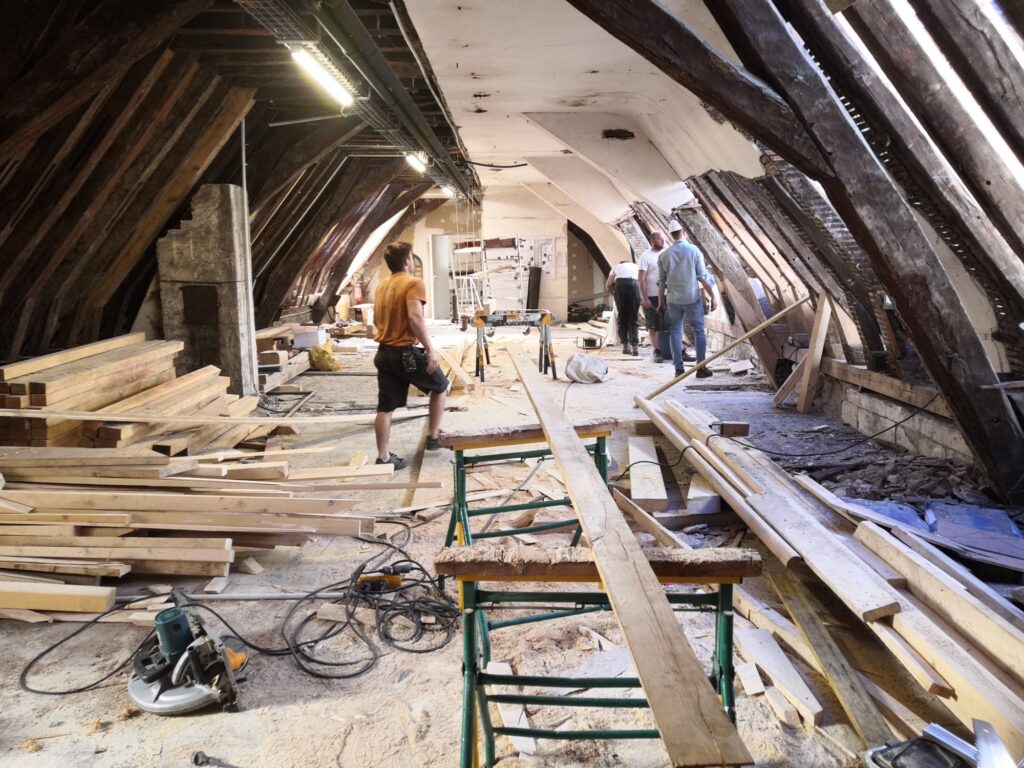 La première phase de réhabilitation, achevée en 2024, a porté essentiellement sur le clos couvert et les aspects structurels critiques du bâtiment : consolidation et restauration complète des maçonneries et des charpentes, remplacement intégral des couvertures deux ailes sur quatre et restauration ou remplacement des grandes menuiseries de la cour. Cette première campagne a permis la stabilisation et la restauration de l’édifice.