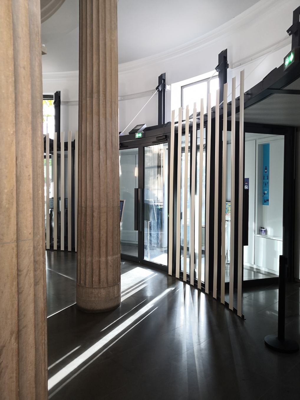 Le projet de restructuration du hall monumental relevait de plusieurs besoins : repenser la sécurité (sas de contrôle, poste d’agent de sécurité), améliorer le confort thermique des agents (successives portes coulissantes dissimulées dans les doublages), redéfinir les flux entrants et sortants des visiteurs, fluidifier les circulations, désengorger l’accueil, repenser la mise en lumière générale, etc.