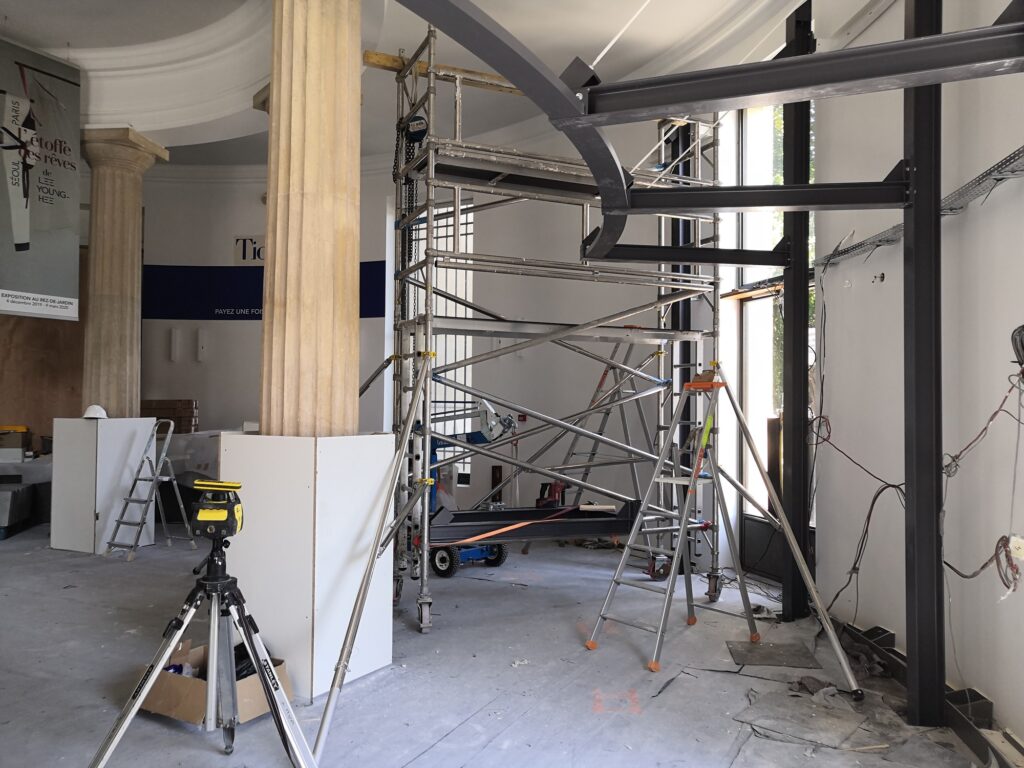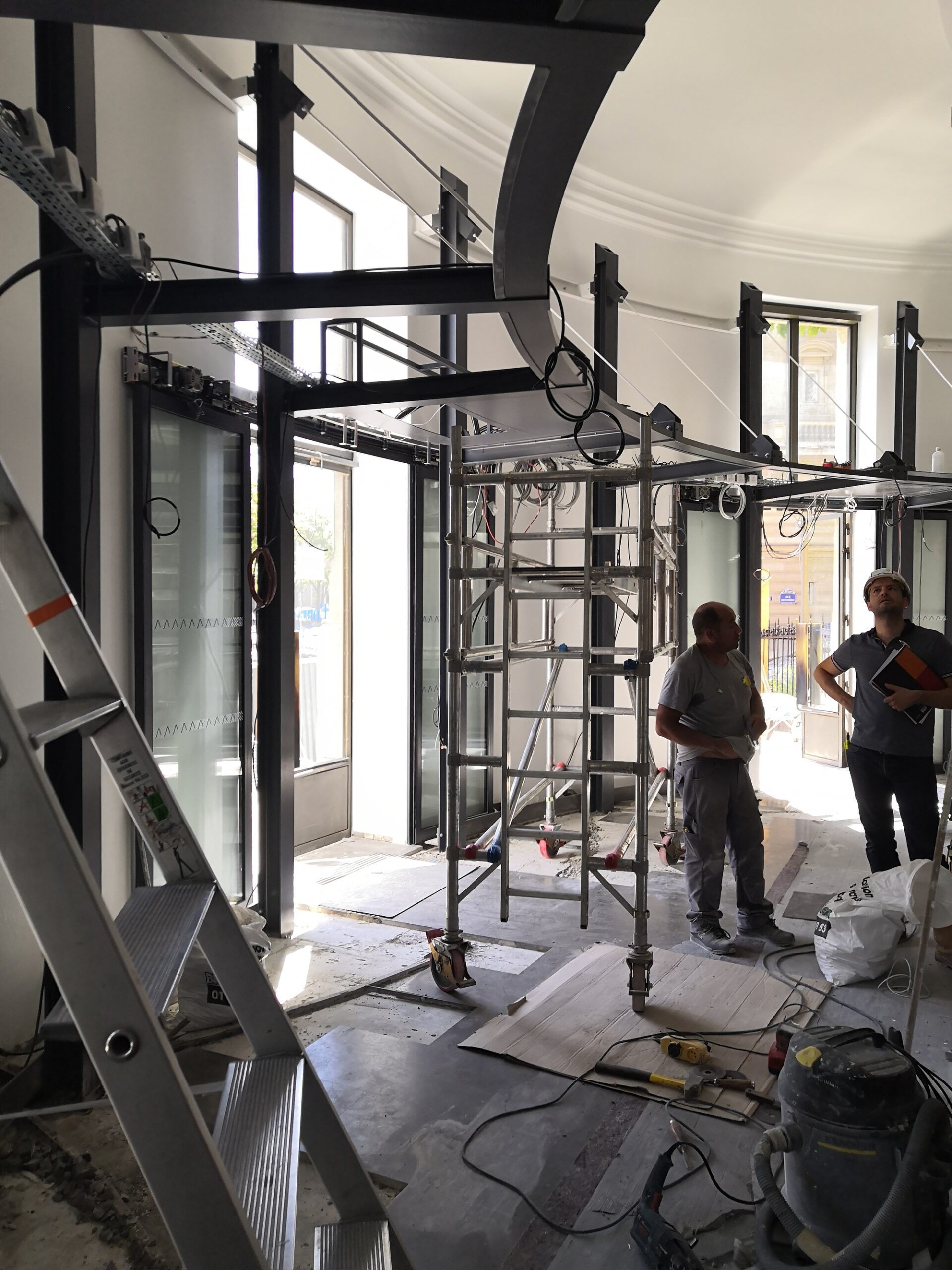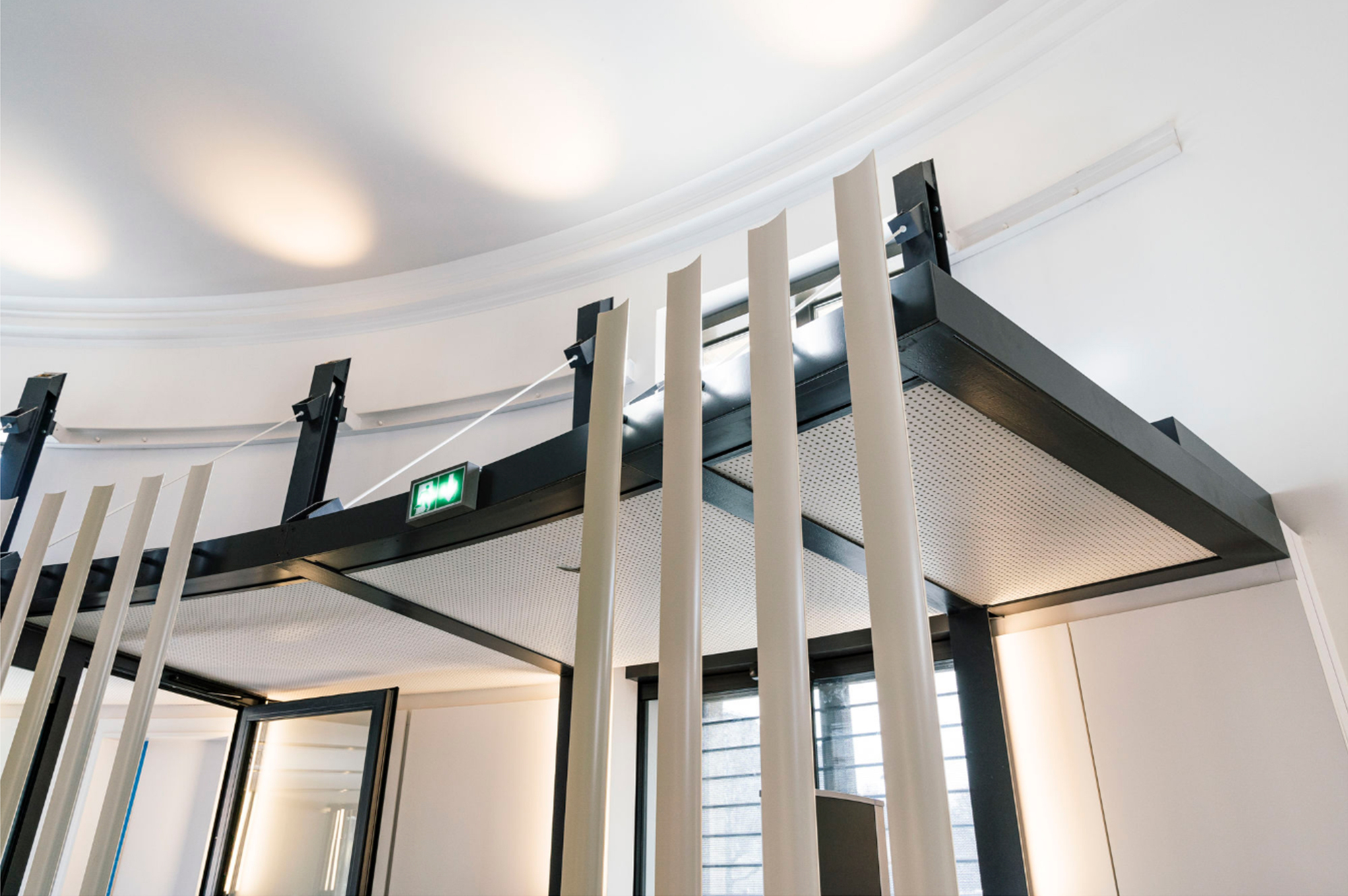 Le projet a ainsi consisté en la construction d’une charpente métallique partiellement suspendue constituée de poteaux et poutres en acier laqué revêtue de verre cintré. Cette structure multifonctionnelle permet aujourd’hui de disposer d’un nouvel espace au sein même du volume du hall.