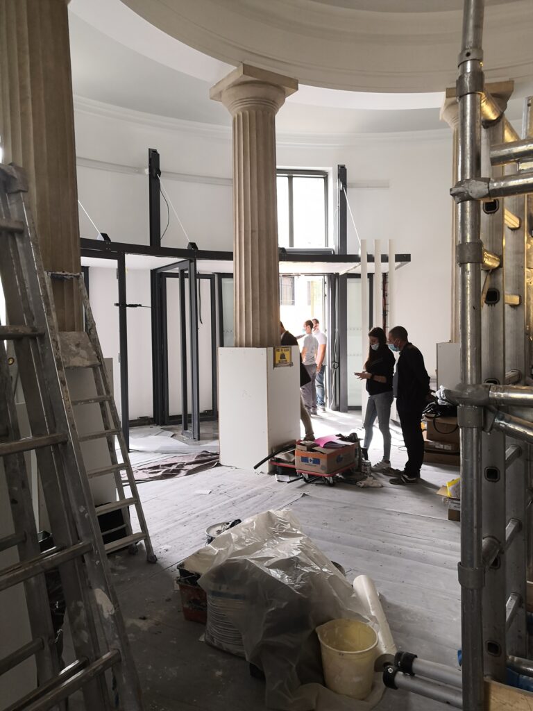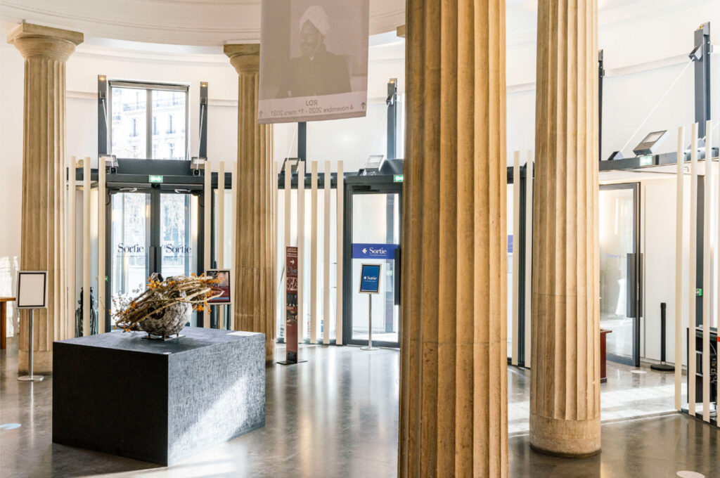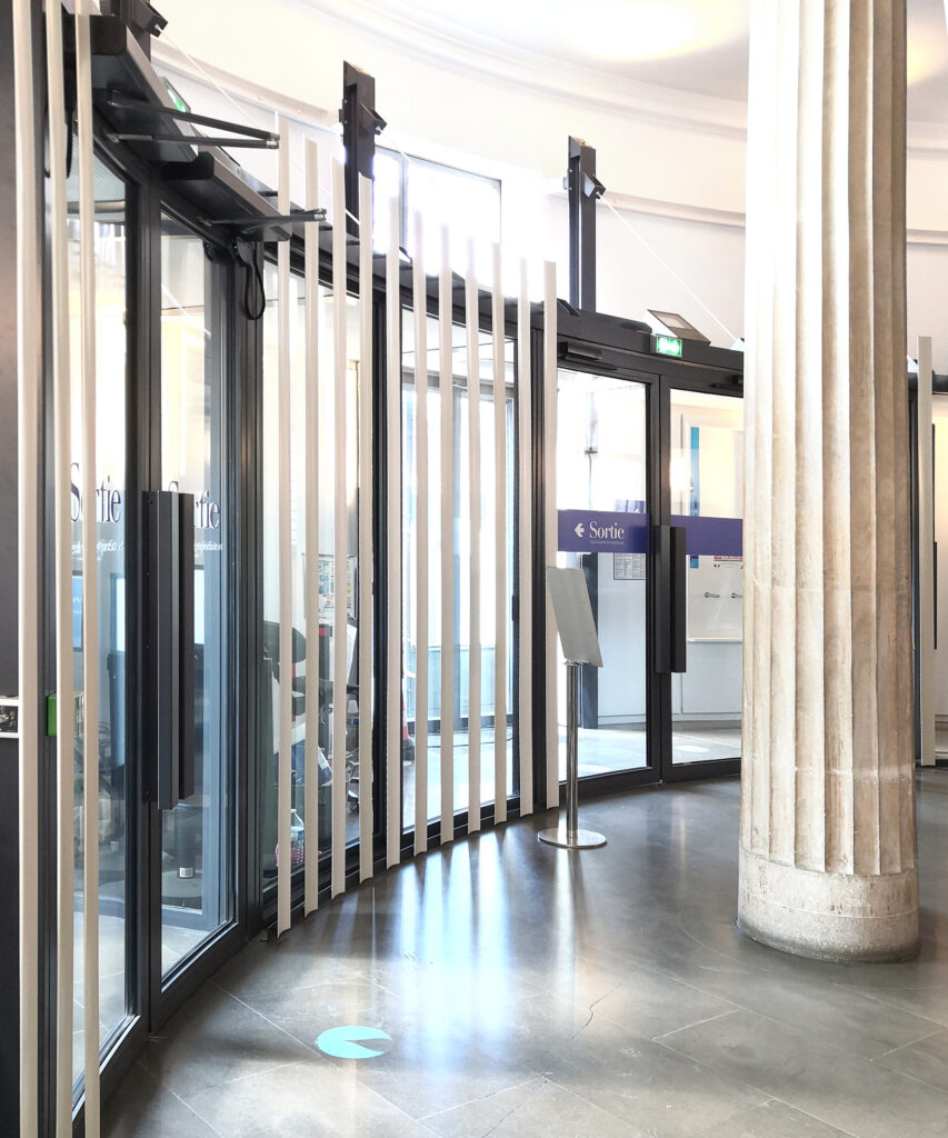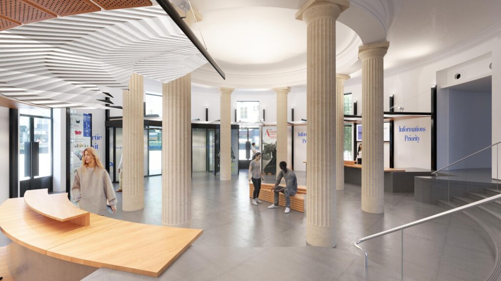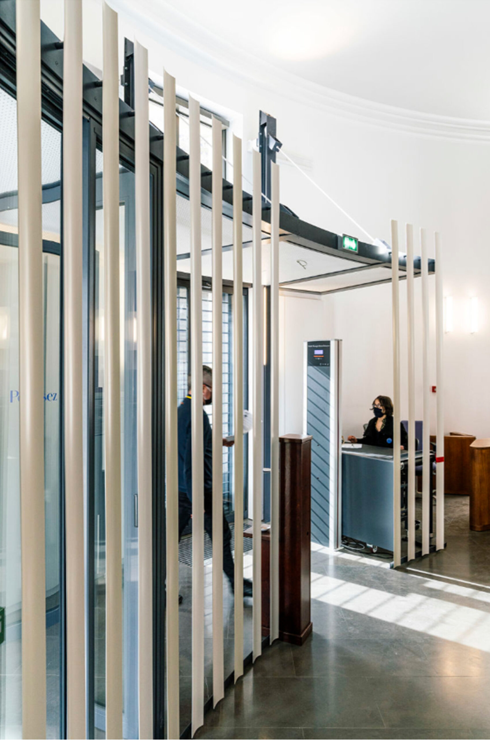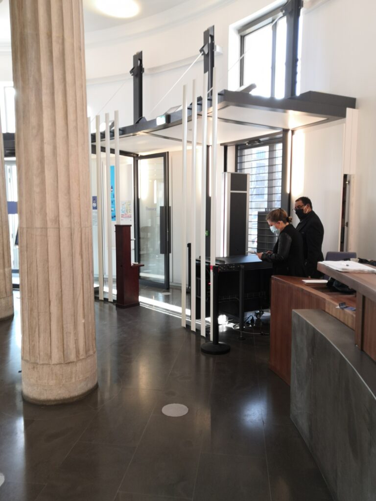 Le projet de restructuration du hall monumental relevait de plusieurs besoins : repenser la sécurité (sas de contrôle, poste d’agent de sécurité), améliorer le confort thermique des agents (successives portes coulissantes dissimulées dans les doublages), redéfinir les flux entrants et sortants des visiteurs, fluidifier les circulations, désengorger l’accueil, repenser la mise en lumière générale, etc.