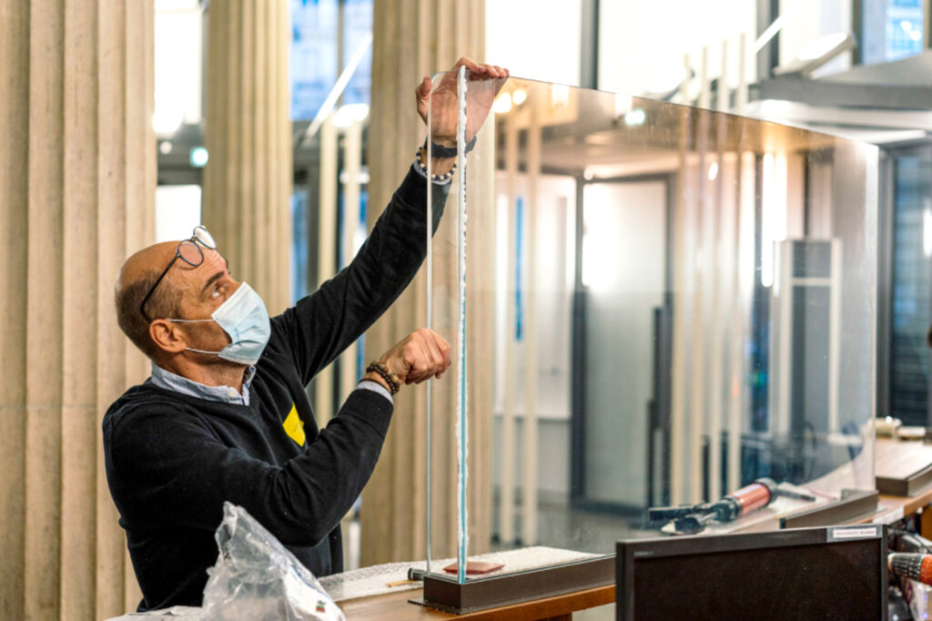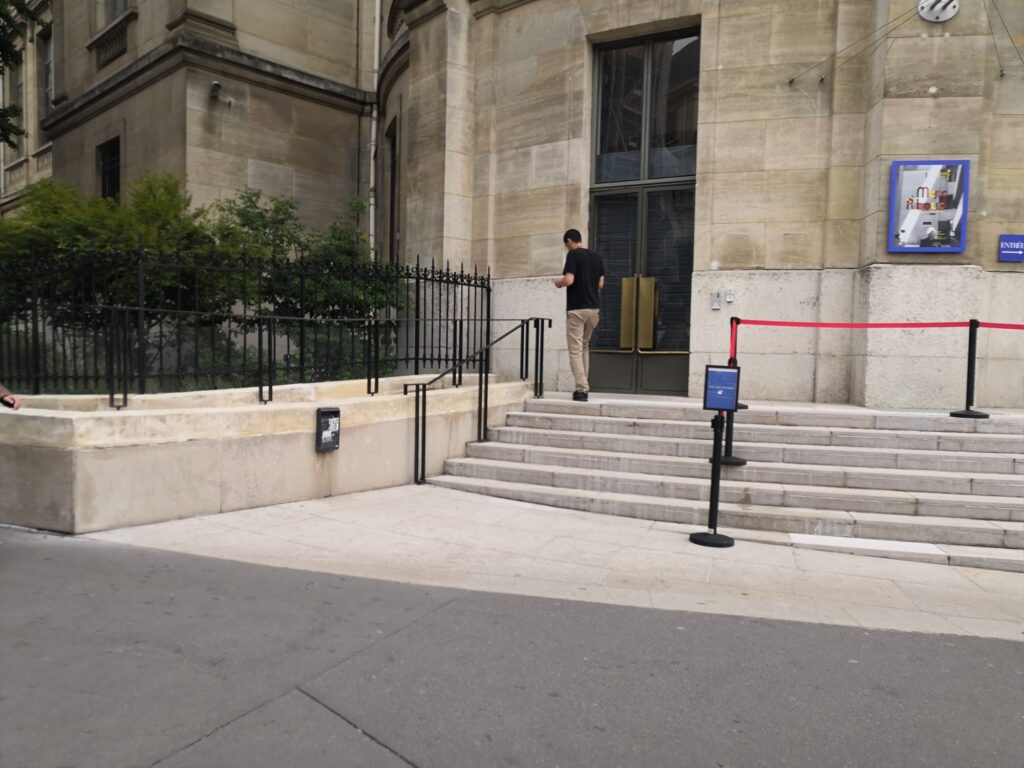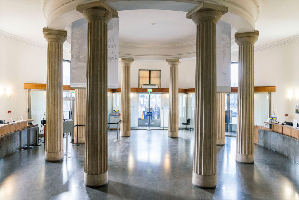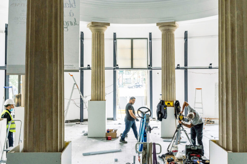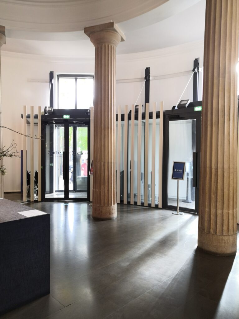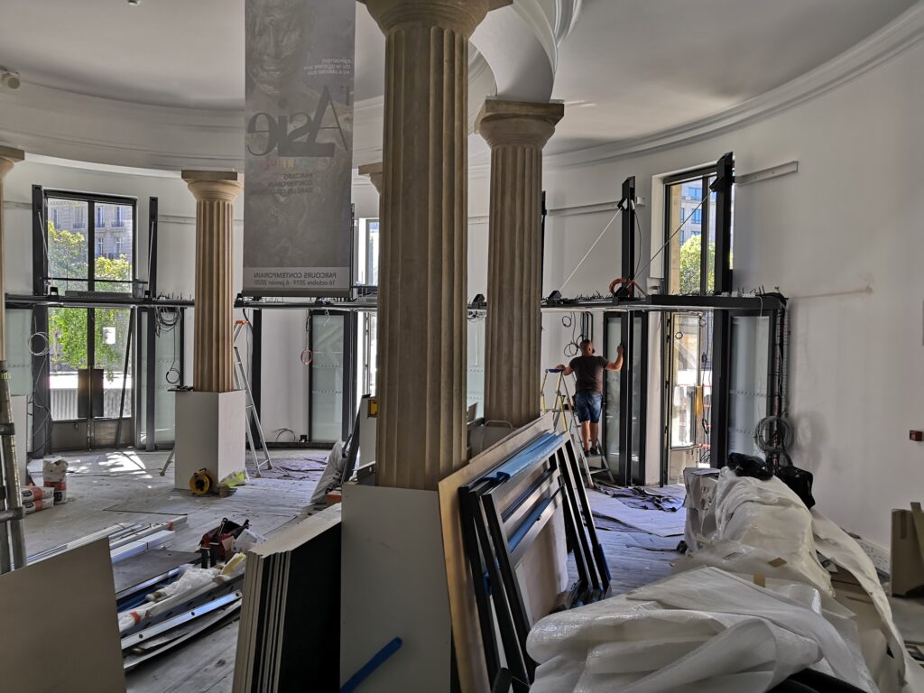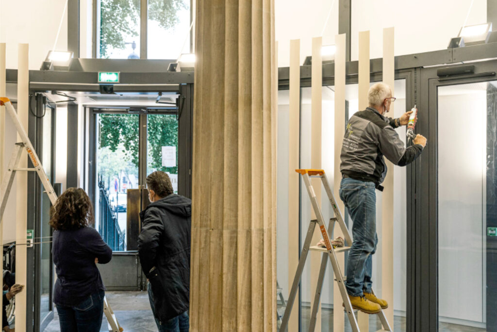 Le projet de restructuration du hall monumental relevait de plusieurs besoins : repenser la sécurité (sas de contrôle, poste d’agent de sécurité), améliorer le confort thermique des agents (successives portes coulissantes dissimulées dans les doublages), redéfinir les flux entrants et sortants des visiteurs, fluidifier les circulations, désengorger l’accueil, repenser la mise en lumière générale, etc.