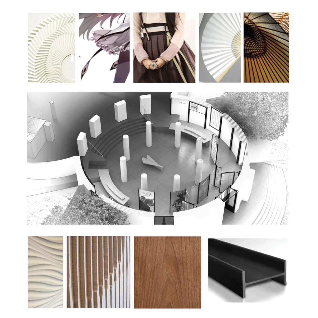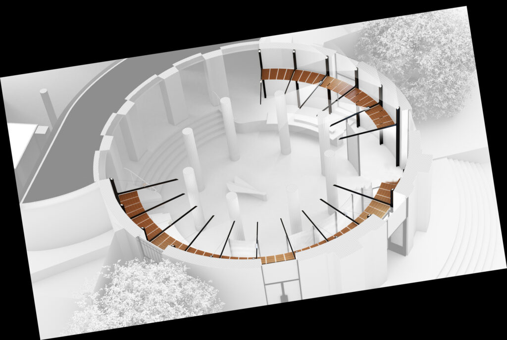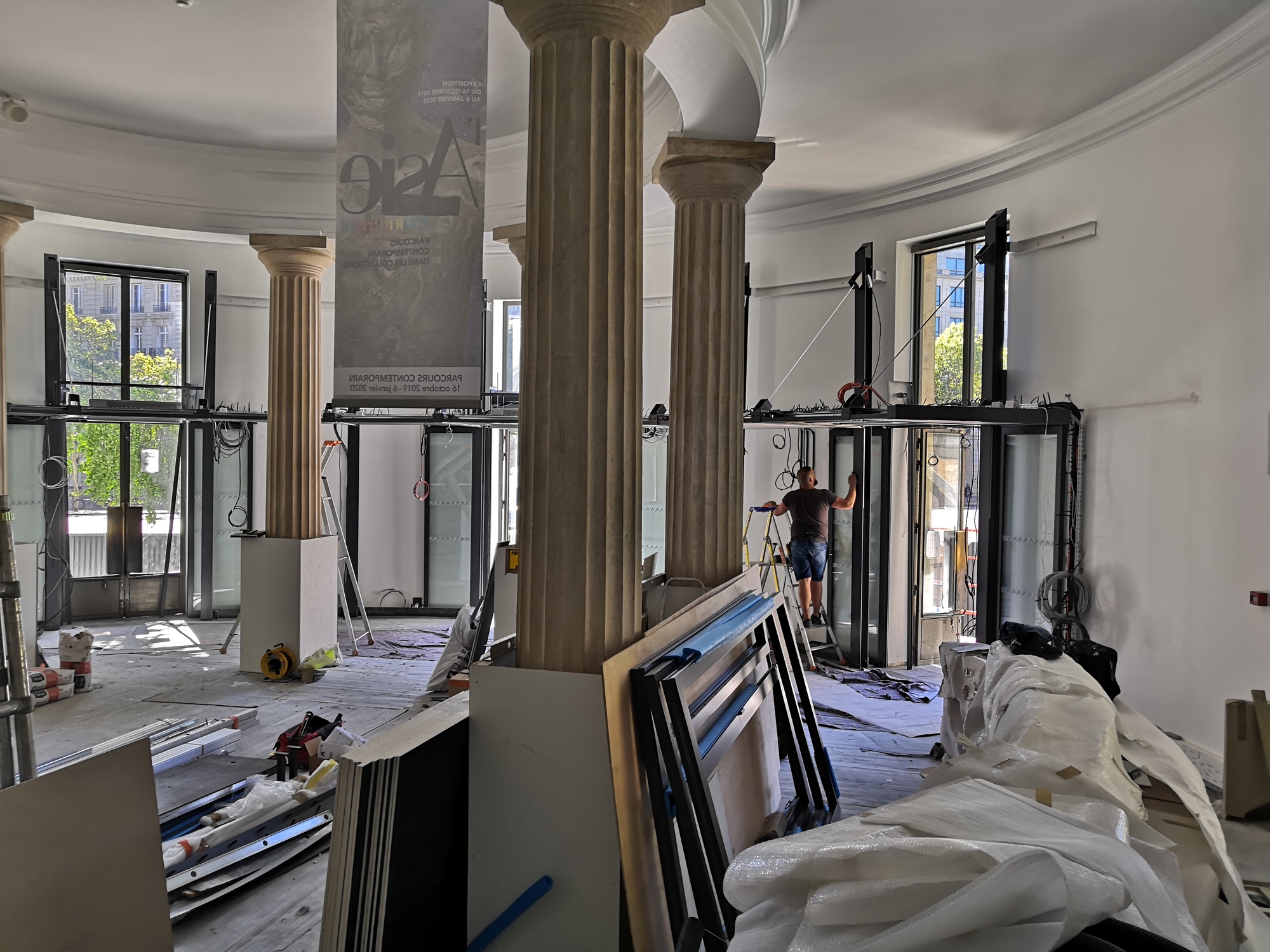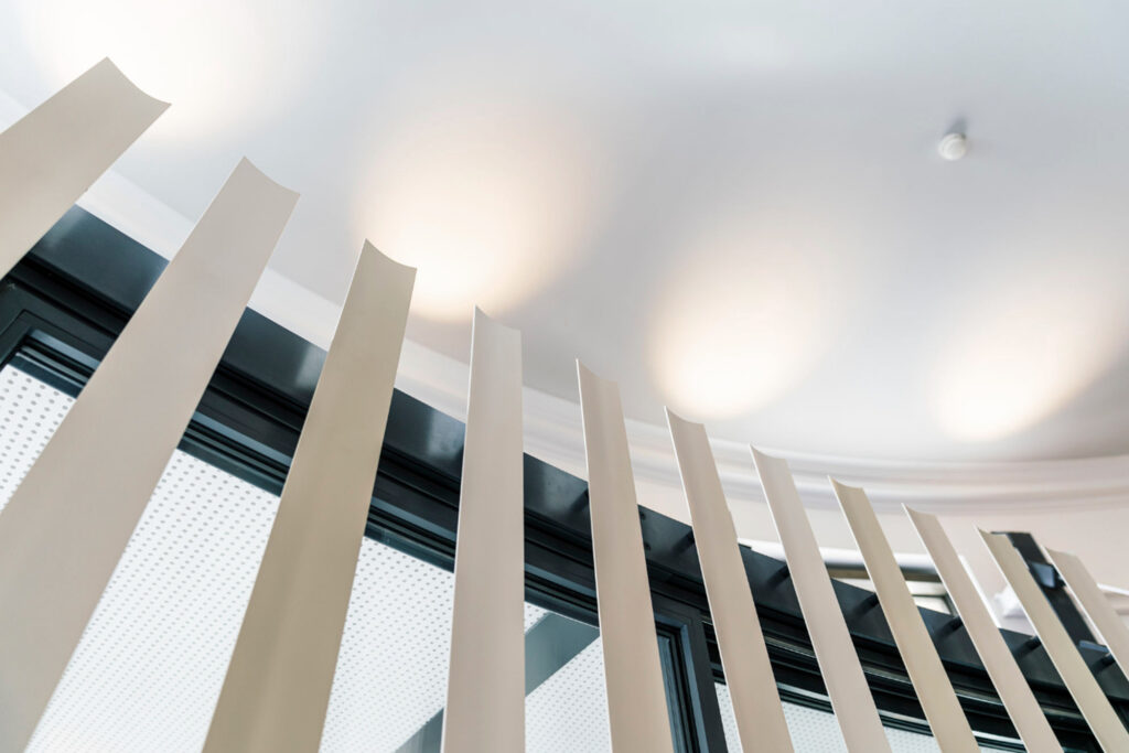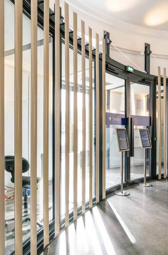 Les lames en acier laqué sont font écho à la matérialité du site : elles installent un dialogue avec les colonnes néoclassiques (vibration des cannelures, jeu de demi teintes en blanc cassé) et proposent un jeu de transparences tamisant la limite entre intérieur et extérieur.
